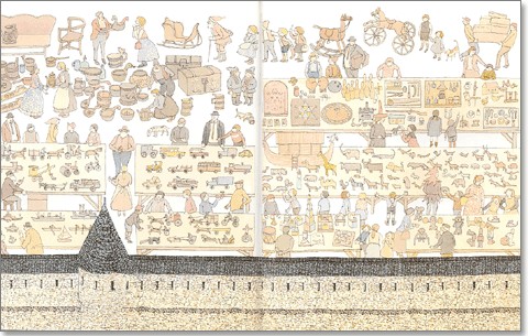 仕事が今日でいろいろ片付いた!来週からは暇が出来るかも。今月のムダ話は、この一年で買った絵本から選ぼう。結構好きなのだ。もっとも、変わった本ではなく、いまさら安野光雅なんか買っている。折にふれ引き出して、思いにふけるのが『蚤の市』だ。安野らしい薄茶色を基調として、蚤の市のいろんな品物が並び、いろんな人が集まる。百人くらいが画面一杯に溢れている。言葉は無い。市全体が落ち着いた幸福感に満たされているのが好きだ。他の人が描くと騒々しい構図になりやすいが。よく眼をこらすと、安野の遊び心に気が付いて、それも楽しい。