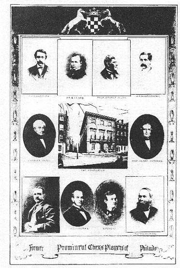 媒体・制作年不明「フィラデルフィアの有名プレーヤーたち」。1890年代か。中央の建物がアセニアム、その左右にヴェザン、ヴェサク。右上にモンゴメリー。