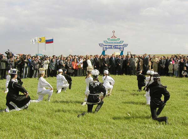 大会サイトでは開会式の様子も紹介されています。なんと野外、草原上にて。「あそこに見える大木に集合してください」? カルムイキヤの歌や踊りが出席者を歓迎したそうで、風はまだまだ冷たそうだけど、リラックスムードがなかなかよい感じ。